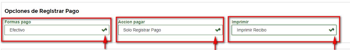 Esta opción permite poner por default las siguientes opciones del módulo de registrar pagos: Formas Pago, Imprimir y Acción al pagar. Una vez elegidas las opciones de pago se debe dar click en el botón Guardar.