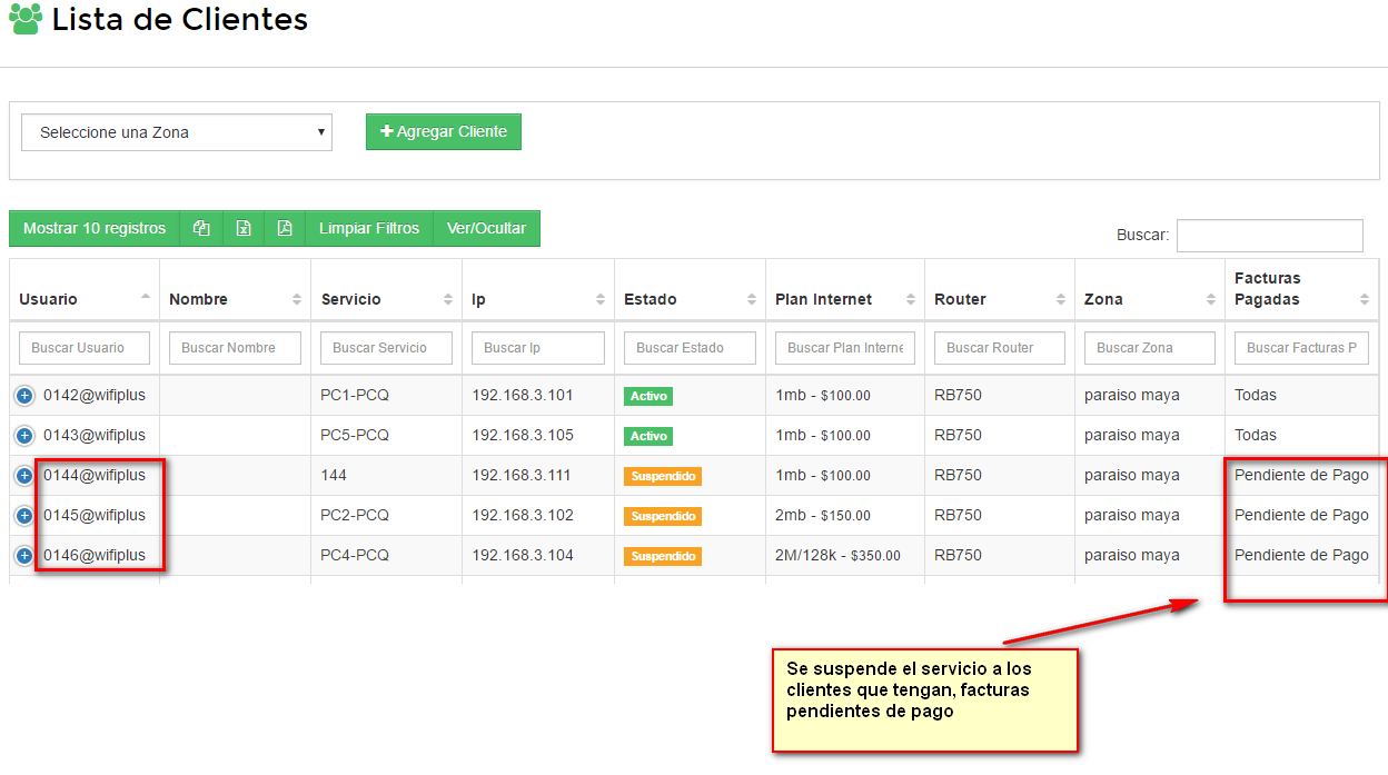R= Una zona es el lugar físico donde se ubican nuestros clientes, esto con la finalidad de agruparlos para poder generar facturas y aplicar corte de servicio de manera masiva automatica. Es recomendable que agrupe sus clientes con mismas fechas de corte en una zona, esto para una mejor administración.