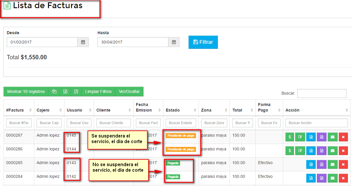 Nota: Es importante que primero se generen las facturas para después aplicar el corte.