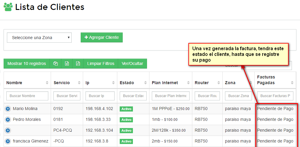 A los clientes que se generó factura, tendran el estado Pendiente de pago hasta que realicen su pago.